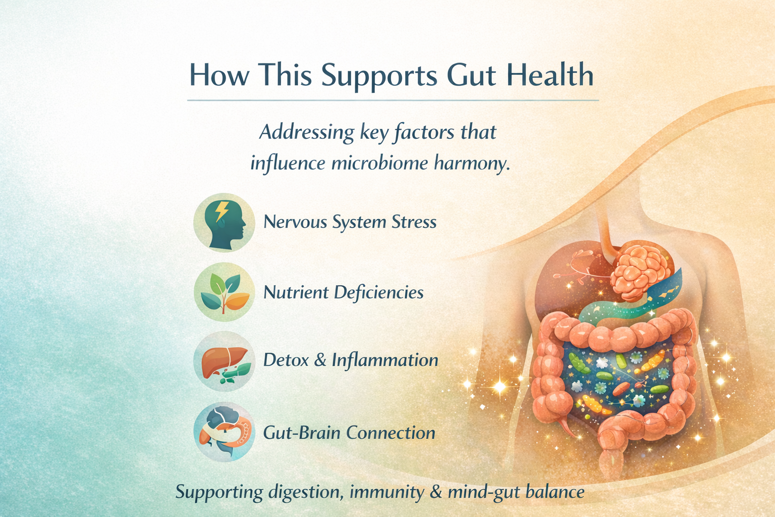 By addressing these underlying influences, we help create conditions where beneficial microbes can flourish, digestion becomes more efficient, and gut-brain communication improves—often leading to better energy, clarity, and overall resilience.